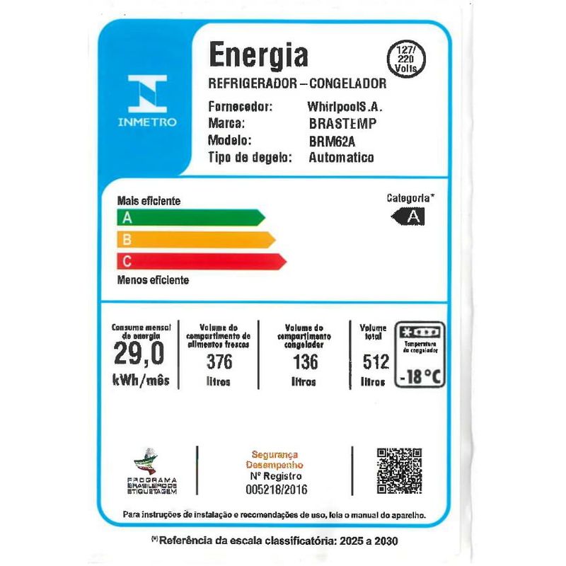 | Textos legais | [1] Resultados obtidos a partir da média de testes internos com: pêra, repolho, tomate, nos modelos BRM62, BRE66 e BRE68. [2] Resultados obtidos a partir de testes internos. com os alimentos: maçã, pêra, kiwi, repolho, chuchu, tomate. [3] Quando comparado a classificação energética da classe C (Padrões Mínimos de Eficiência Energética - Minimum Energy Performance Standards - MEPS) no padrão INMETRO (Norma IEC 62552-3:2020). [4] Maior capacidade líquida do compartimento freezer, considerando geladeiras 2 portas (com freezer superior) do mercado, segundo a GFK FY'2024. [5] Medidas das refeições congeladas: 150 x 100 x 40mm. [6] Teste realizado conforme procedimento interno, que simula carne congelada (conforme pacote da IEC 62552-1:2015 Anexo C) do momento da queda de energia até -6°C, com temperatura ambiente de 25ºC, sem aberturas de portas no período sem energia. [7] Modelos Cor Inox e Black Inox. Conforme política de garantia descrita no manual do produto, a garantia cobre defeitos de fabricação, mas não inclui danos causados por mau uso. [8] Mais de 100 testes, incluindo os exigidos pela regulamentação vigente. |
