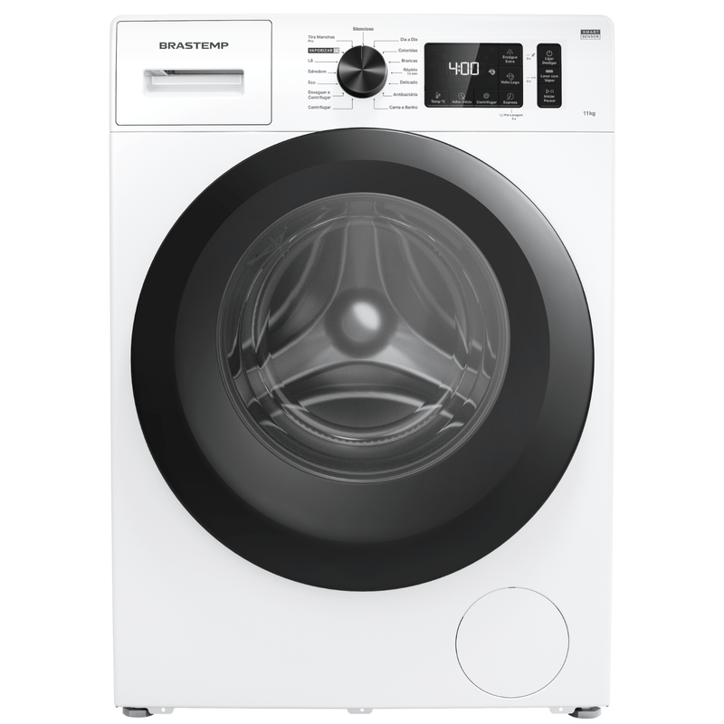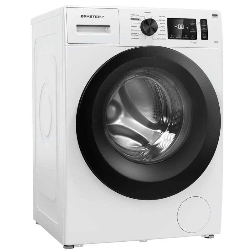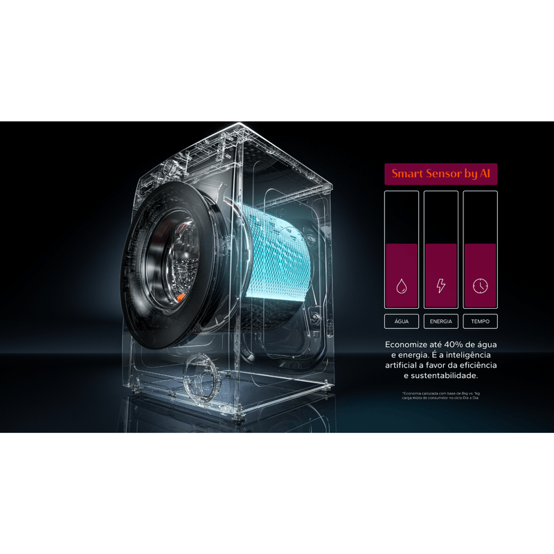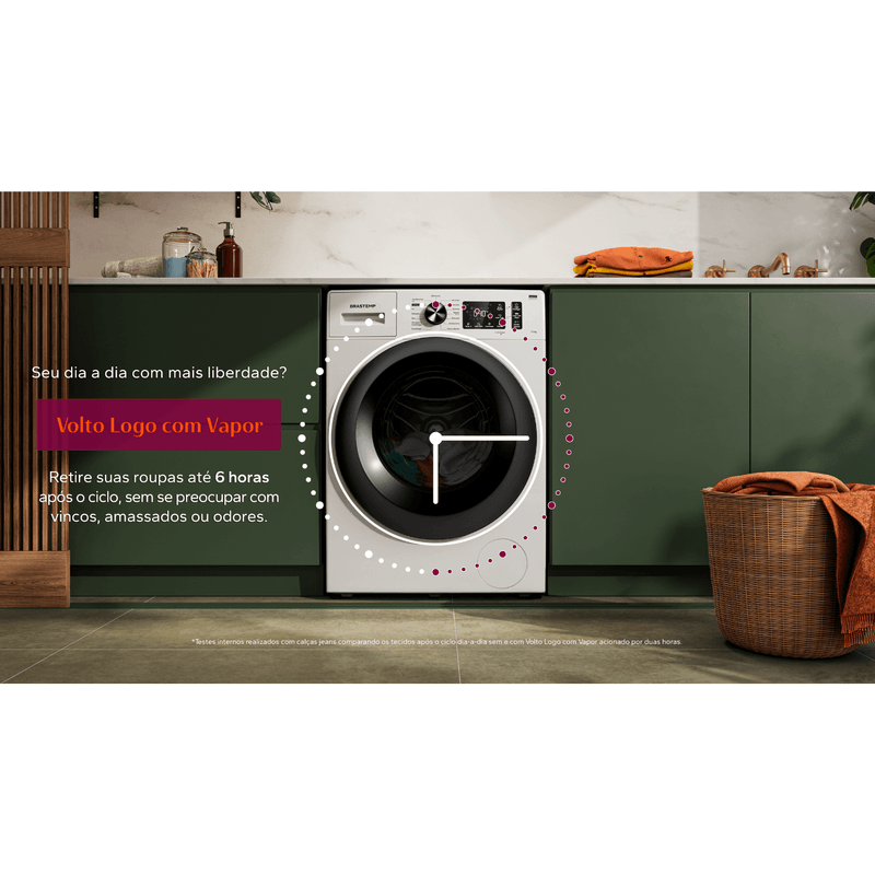 | Textos legais | [1] Testes em água fria: remove sangue bovino, chocolate, gordura, carvão, vinho tinto. Vapor elimina germes/bactérias. Percepção interna: remove 63 manchas em algodão (lista no manual). Eficácia comprovada. [2] Testes em água fria: remove sangue bovino, chocolate, gordura, carvão, vinho tinto. Vapor elimina germes/bactérias. Percepção interna: remove 63 manchas em algodão (lista no manual). Eficácia comprovada. [3] Testes internos realizados com calças jeans comparando os tecidos após o ciclo dia-a-dia sem e com Volto Logo com Vapor acionado por duas horas. **Para mais informações, verifique o manual do usuário." [4] Testes internos: redução de até 40% de vincos em algodão, alta remoção de odores, manchas difíceis (sangue, chocolate, gordura, carvão, vinho) em água fria, elimina germes com vapor, previne amassados em jeans (ciclo 2h). Detalhes no manual. [5] O tempo para utilizar a função pode variar dependendo do ciclo selecionado. [6] Conforme testes realizados por Armstrong Forensic Laboratory, Inc. por meio de análises de resistência a propagação de Staphylococcus aureus (ATCC 6538), Pseudomonas aeruginosa (ATC 15442), e Klebsiella pneumoniae (ATCC 4352) em tecidos padronizados. [7] Lava até tamanho casal [2.1m x 2.4m] [8] Ciclo recomendado para cargas pequenas e com pouca sujidade. |